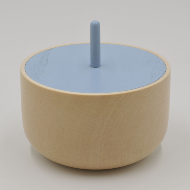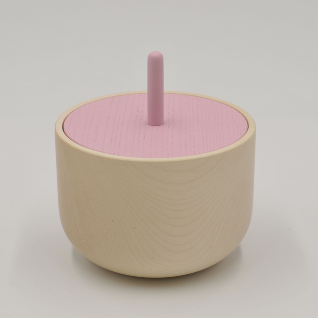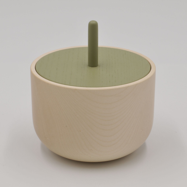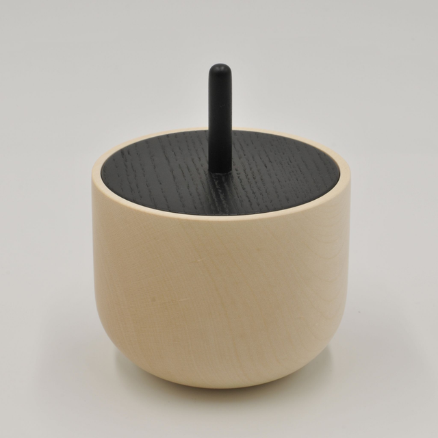 Zuckerdose aus gedrechseltem Ahornholz mit Deckel aus lackierter Esche.